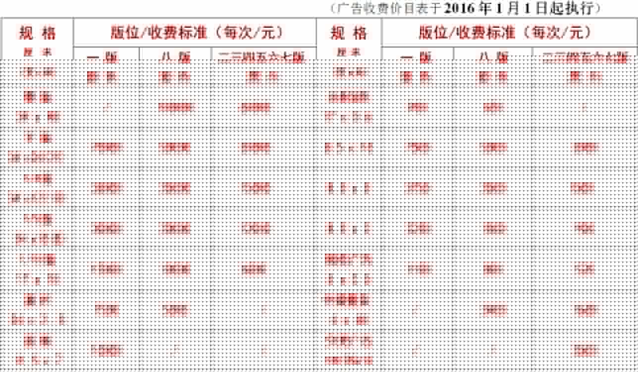 6、本報(bào)廣告刊登規(guī)格有整版、1/2版、1/4版、1/5版、2/5版、1/10版等,其中一、四版為彩色廣告;五、八版為套紅廣告;其余版面為黑白廣告。