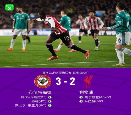 北京時間10月26日,英格蘭足球超級聯賽第9輪展開較量,布倫特福德坐鎮主場迎戰利物浦。上半場瓦塔拉倒鉤破門,維爾茨中路爆射滑門而出,沙德單刀擴大比分,凱爾凱茲中路打門扳回一球,下半場蒂亞戈點射破門,瓦塔拉屢造險,薩拉赫爆射扳回一球。最終,全場比賽結束,布倫特福德以3-2戰勝利物浦。