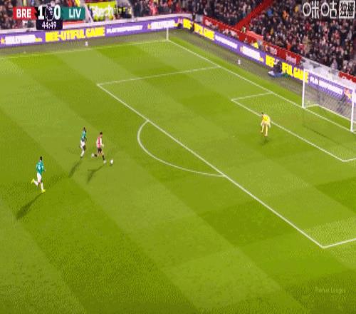第45分鐘,沙德單刀低射破門,布倫特福德2-0利物浦
