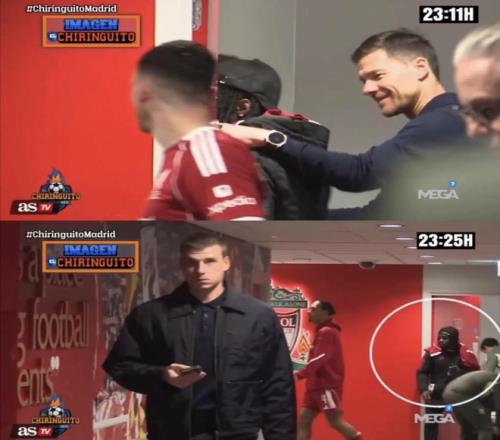 據西班牙六臺拍攝視頻顯示,阿隆索在皇馬和利物浦的比賽賽后與弗林蓬進行了14分鐘的秘密會談。